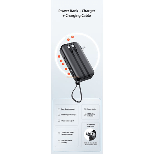 Usams 3 In 1 20W Quick Charge Wall Charger Powerbank With In Built Cables